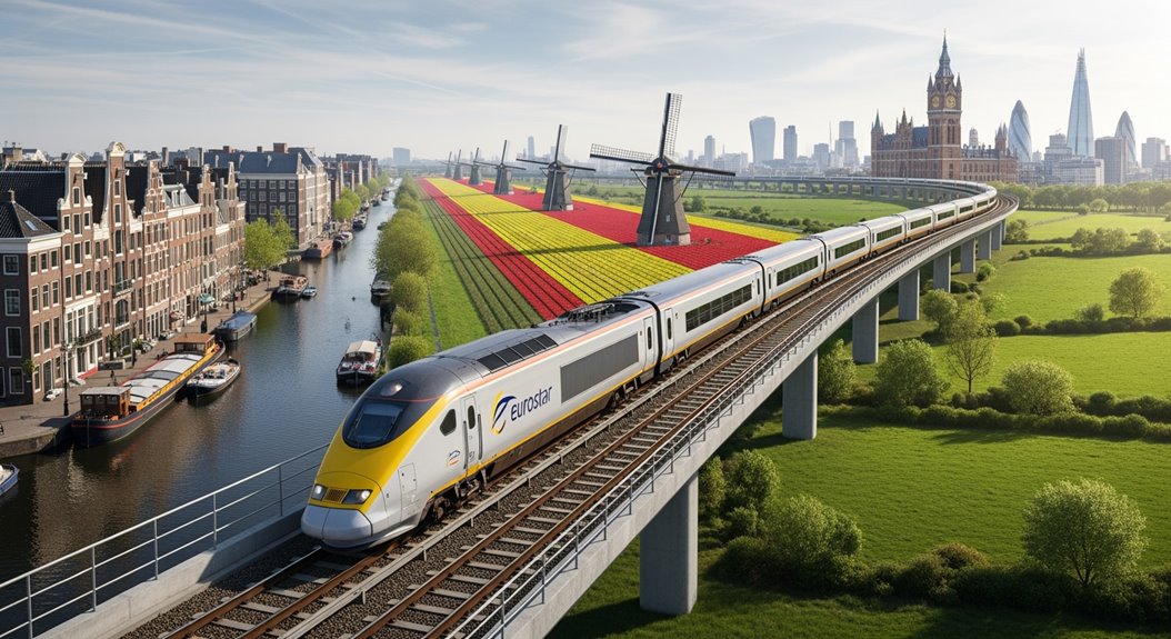 The Eurostar runs direct trains from Amsterdam Centraal to London St Pancras multiple times daily, covering 585 kilometers in roughly four hours. Standard tickets start at £51, though first class begins at £97 if you want a meal included. Passengers need a valid passport and should arrive 20 minutes early for security checks. Book up to six months ahead for better prices, especially avoiding pricey Friday and Sunday departures. There’s more to take into account for smooth travels.